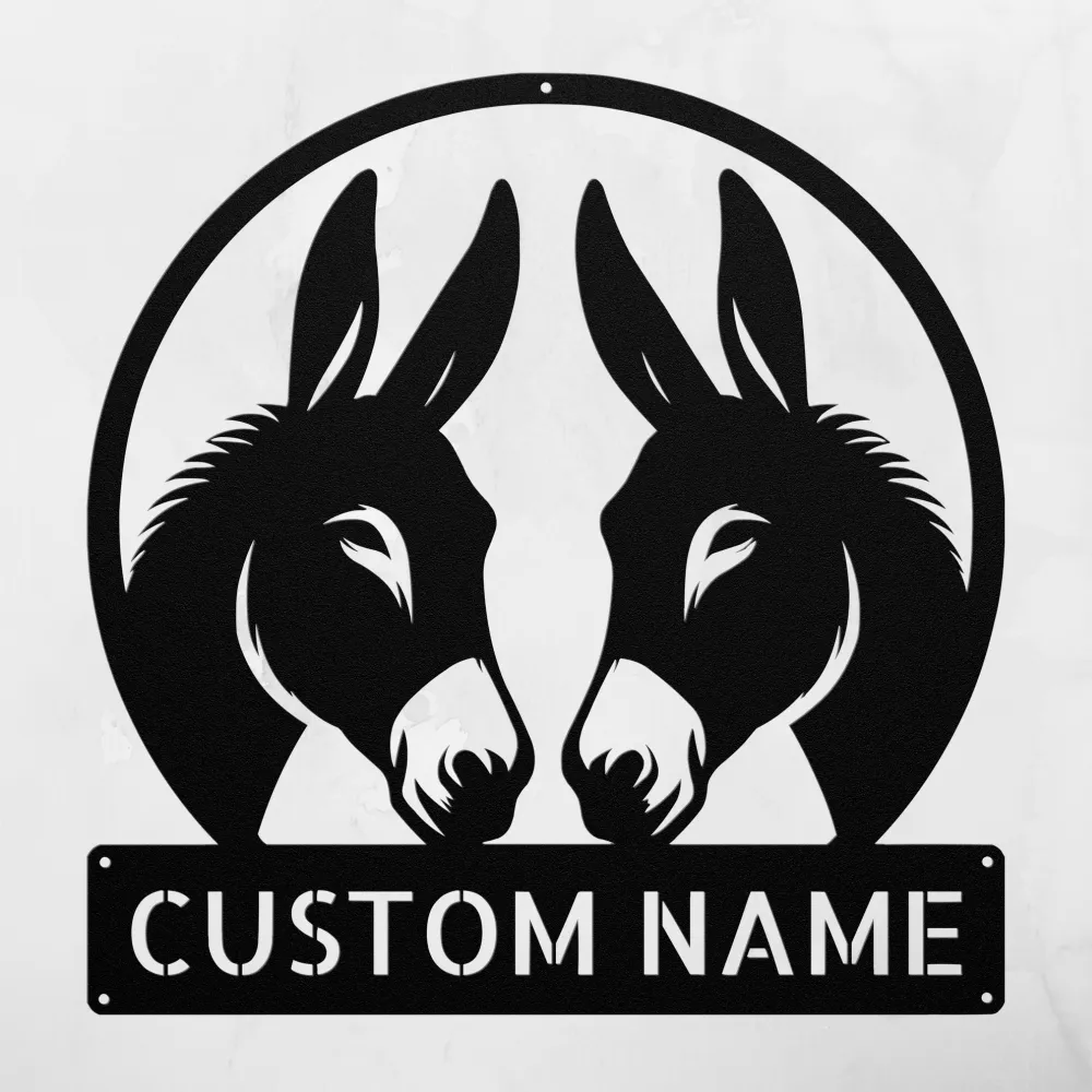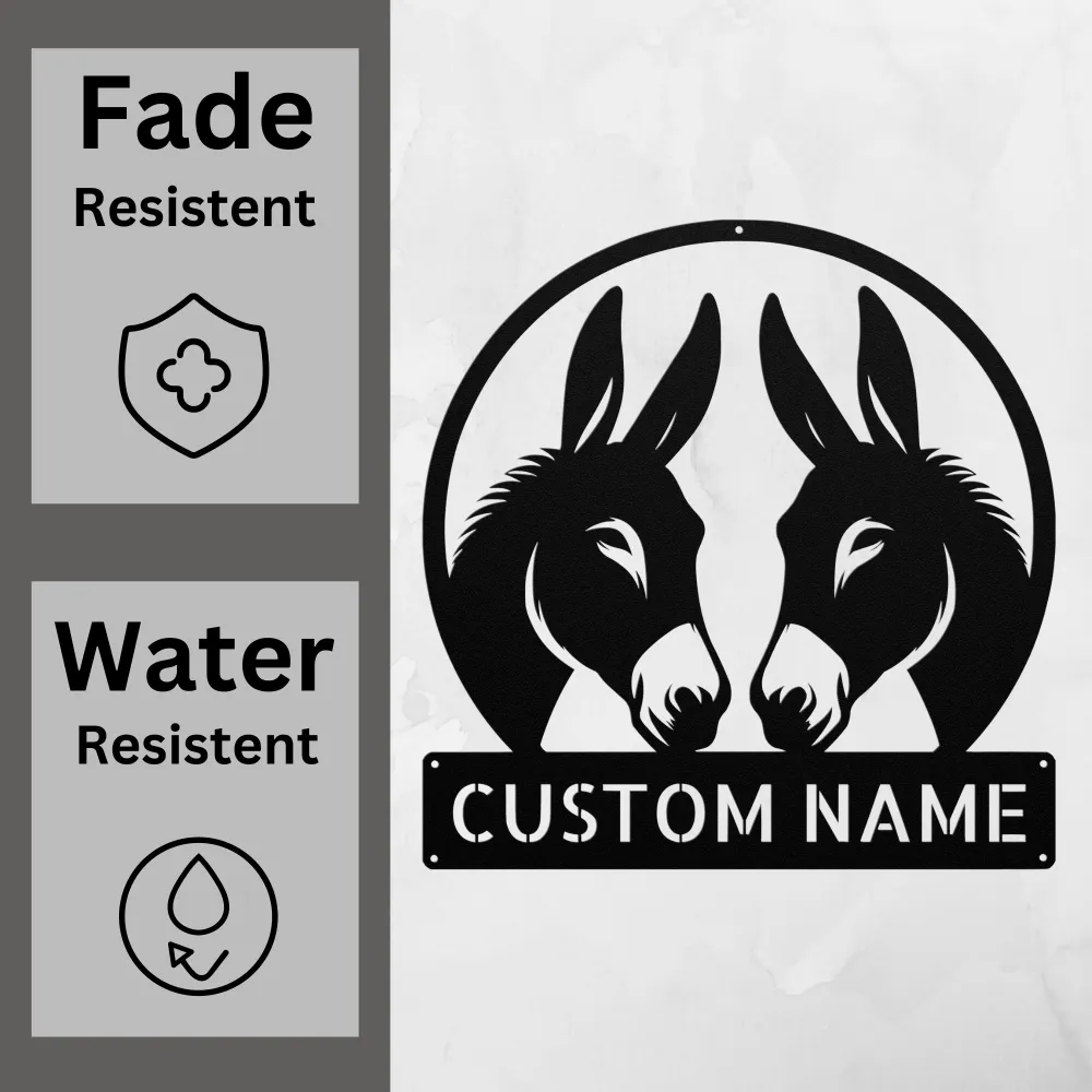 Celebrate love with a Custom Couple Donkeys Metal Sign – durable 16-gauge metal, customizable design, powder-coated finish, and various sizes/colors to suit any space.
