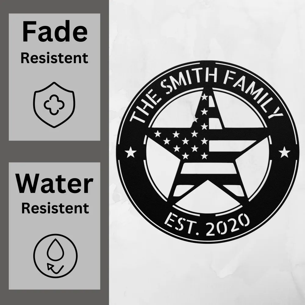 Custom US Star Last Name Metal Sign celebrates your family heritage. A stylish custom name plaque with a patriotic star for homes or gifts.