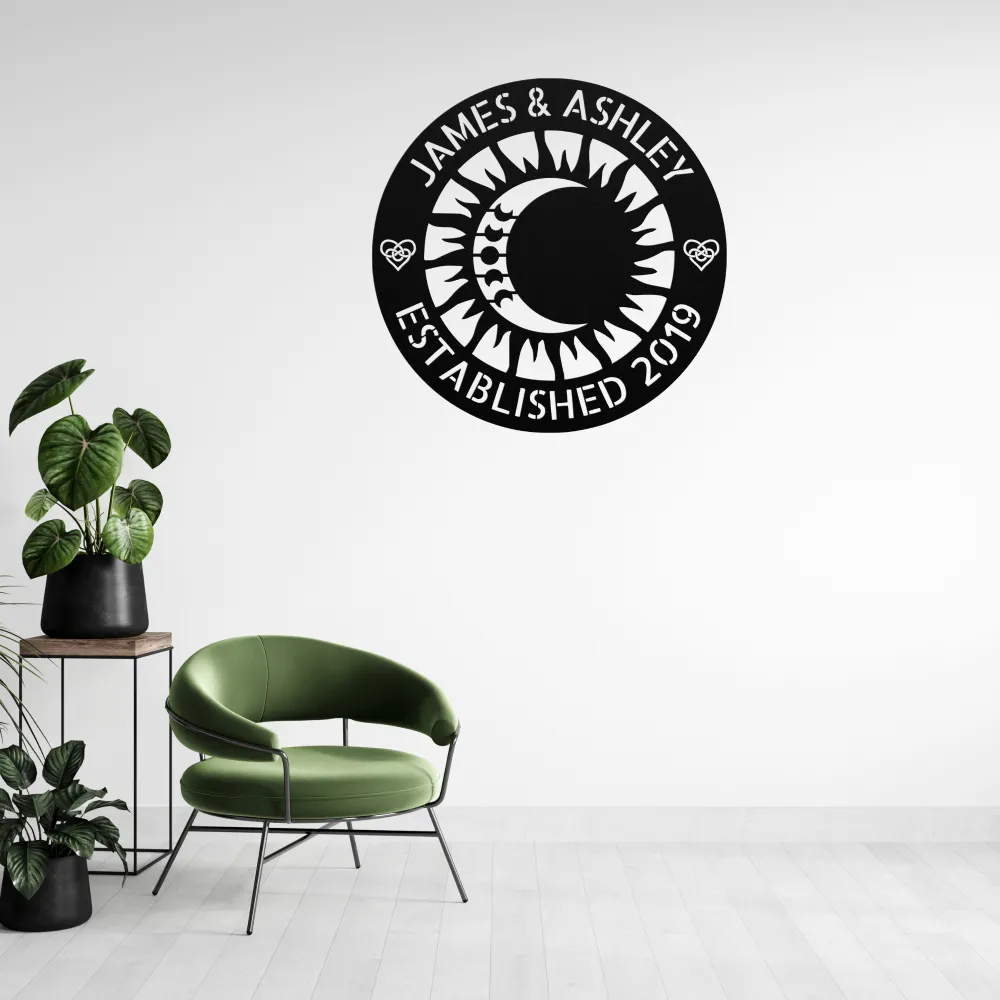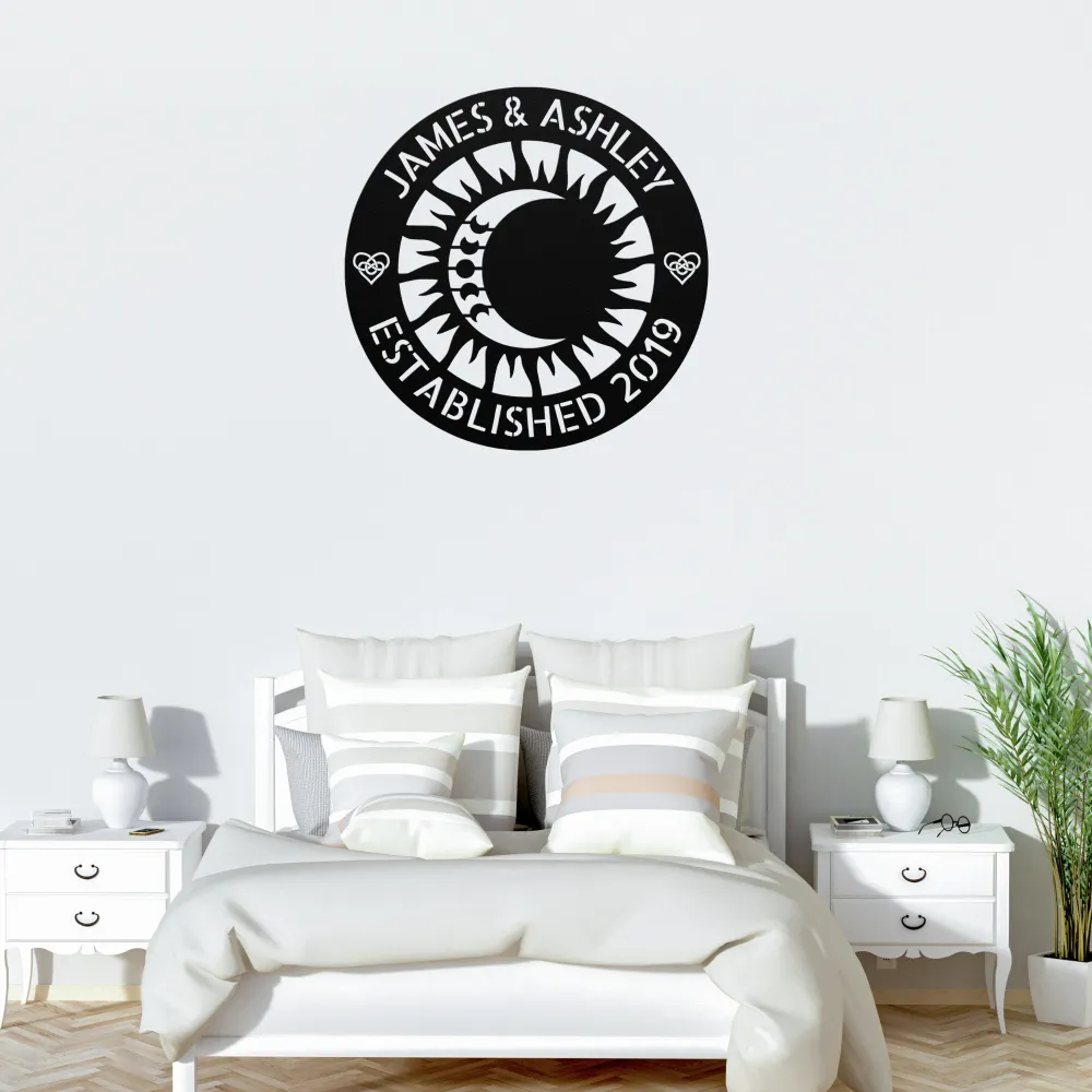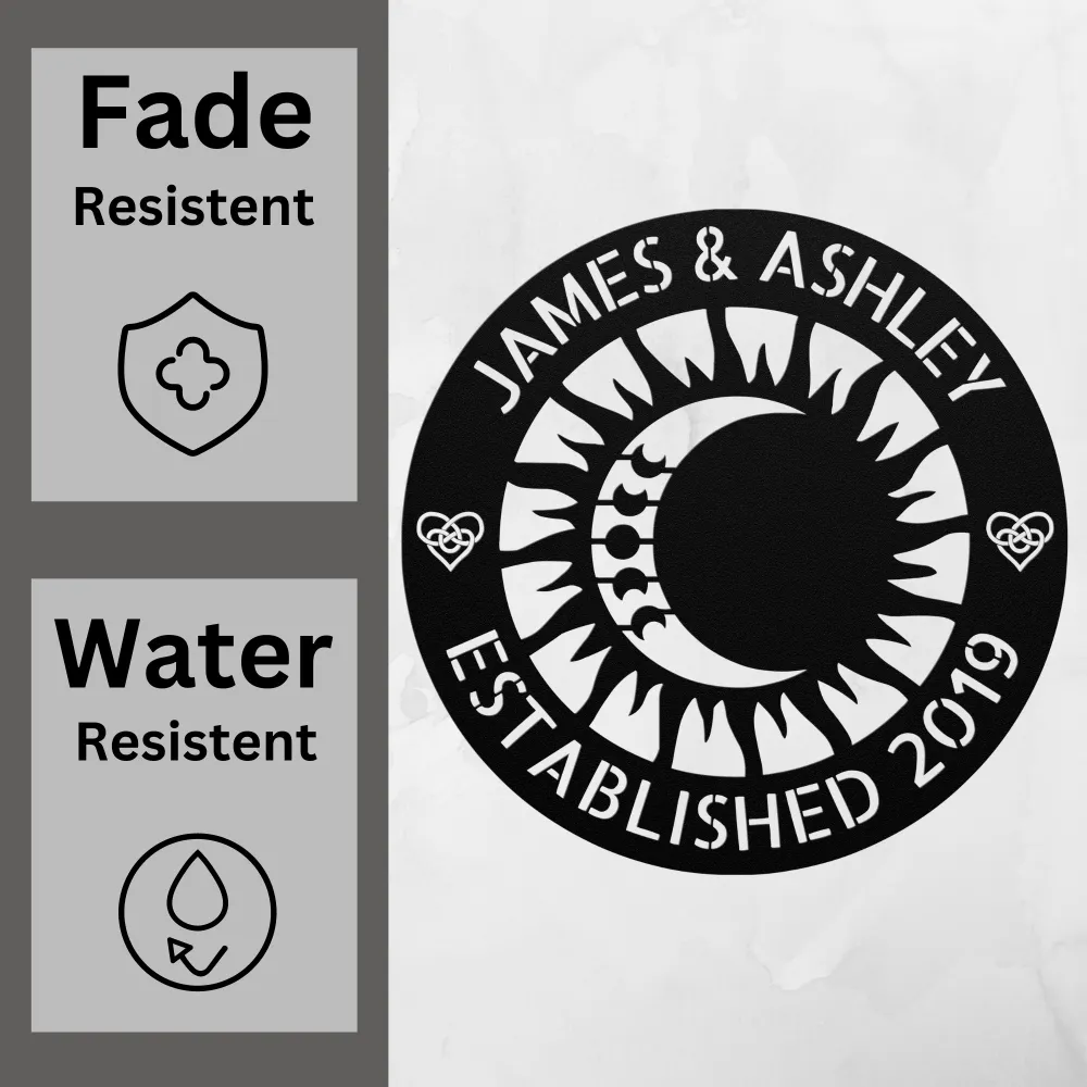 Personalized Couple Moon Sun Metal Sign to symbolize harmony and love. Customize with your names or date for a meaningful, lasting gift.