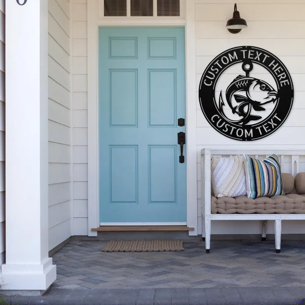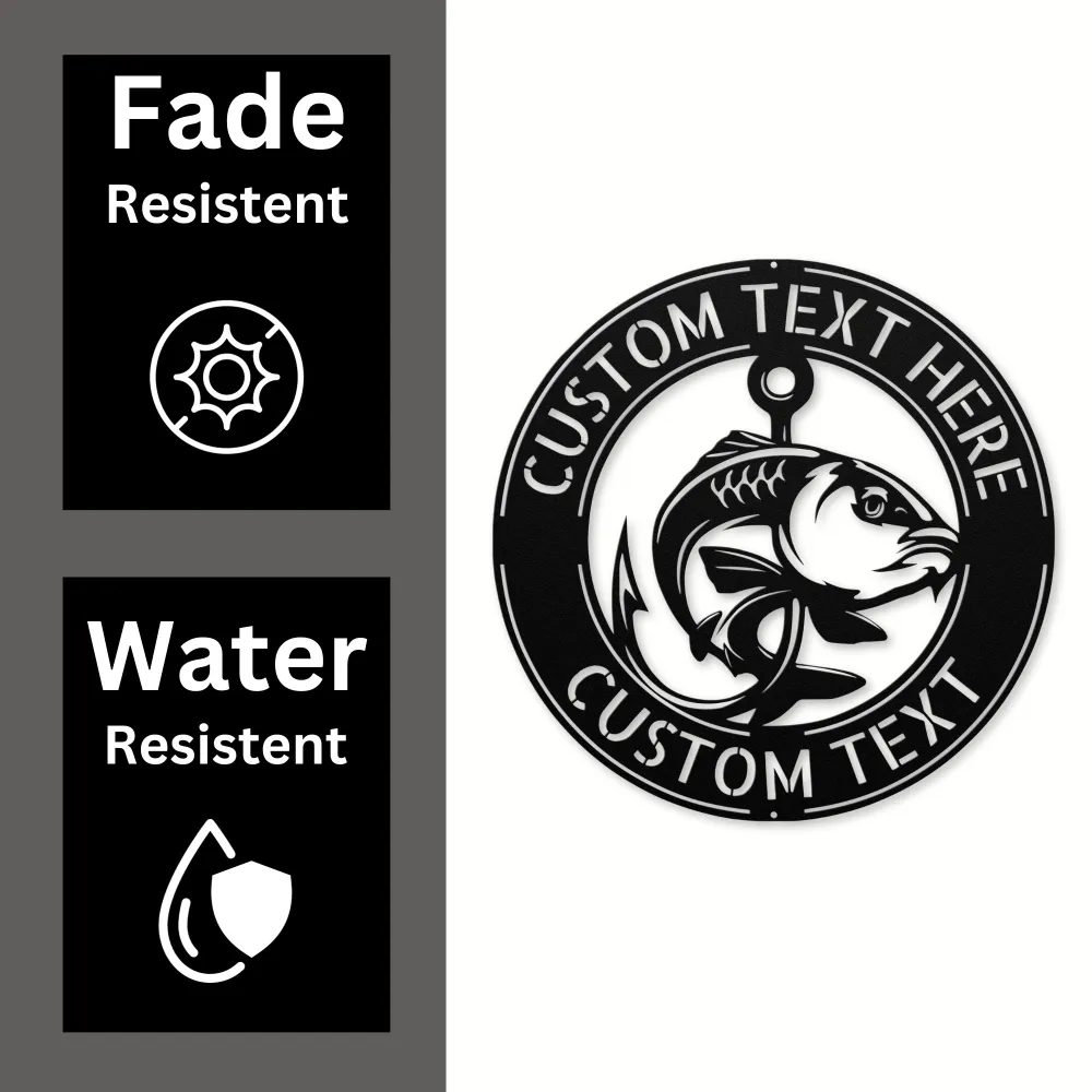 Personalized Fish Metal Wall Art Sign custom-made with your name or favorite fishing spot. A unique, durable decoration for homes, cabins, or gifts.