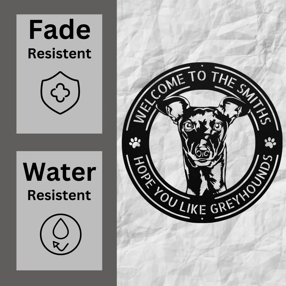 Personalized Greyhound Metal Sign πΎπ Made from 16 gauge metal with a powder-coated finish. Customize with names or messages. Perfect for Greyhound lovers!