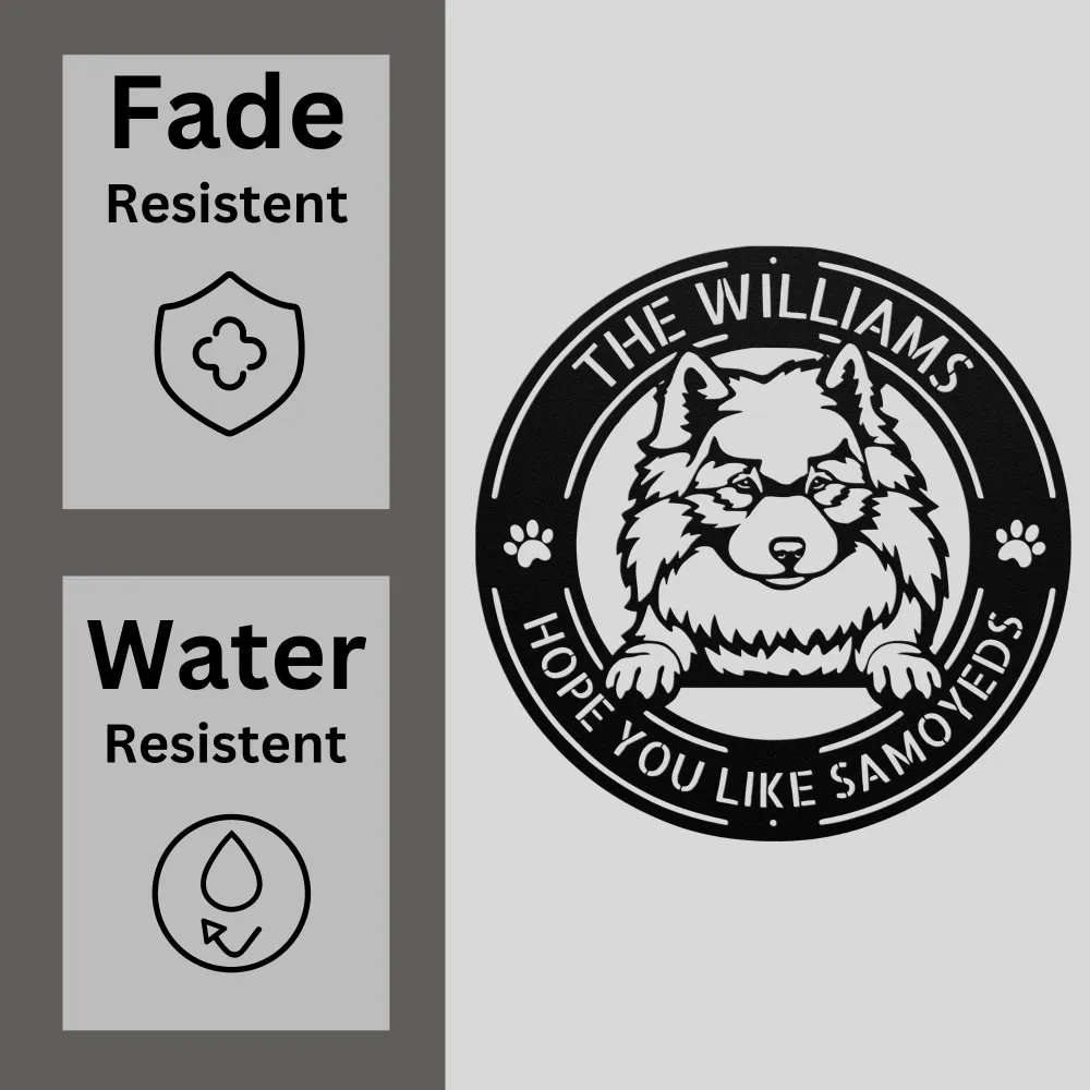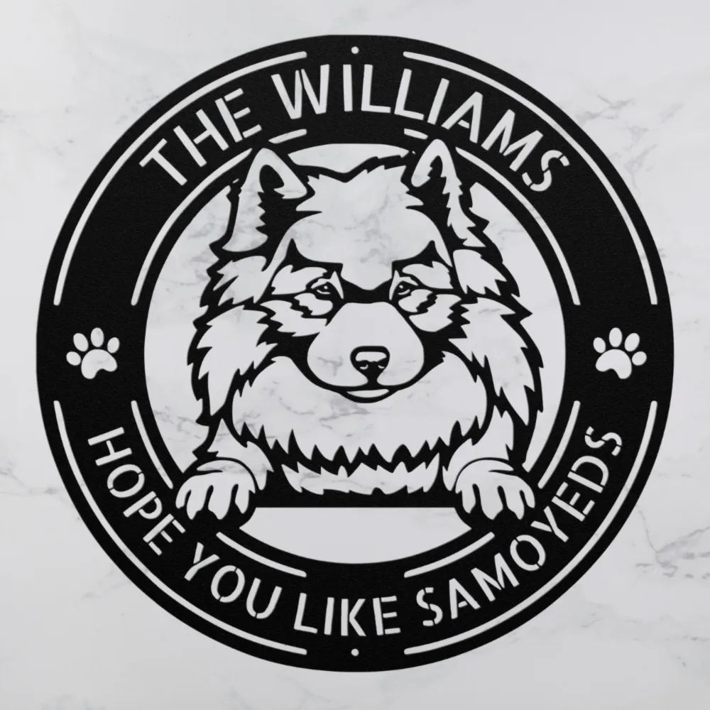 Personalized Samoyed Dog Metal Sign 🐾❄️ Made from 16 gauge metal with a powder-coated finish. Customize with names or messages. Perfect for Samoyed lovers!