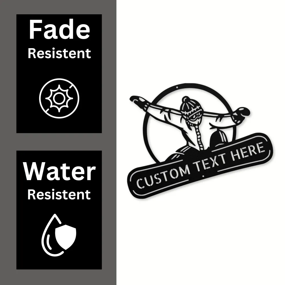 Personalized Snowboard Metal Art Sign with a name or phrase. Durable, powder-coated steel for indoor & outdoor decor. Perfect for snowboarders & winter lovers.