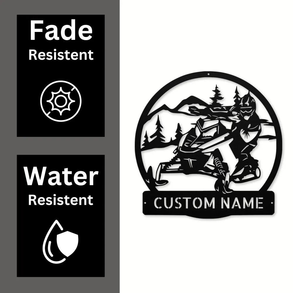 Personalized Snowmobile Scene Metal Sign for winter lovers. Personalize with a name or location. Durable steel, weather-resistant, perfect for cabins & lodges!
